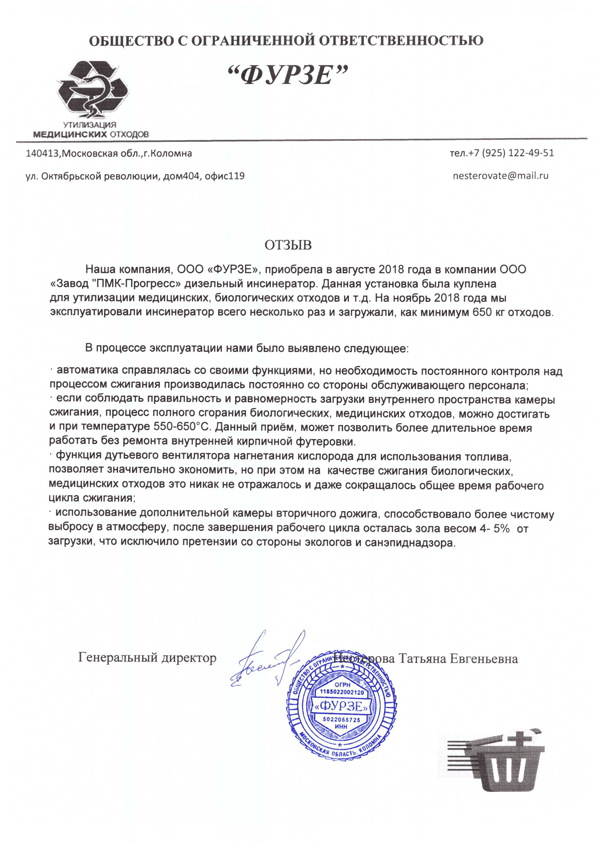Наша компания, ООО «ФУРЗЕ», приобрела в августе 2018 года в компании ООО «ПМК-Прогресс» дизельный дизельный инсинератор. Данная установка была куплена для утилизации медицинских отходов, биологических и т.д. На ноябрь 2018 года мы эксплуатировали инсинератор всего несколько раз и загружали, как минимум 650 кг отходов.