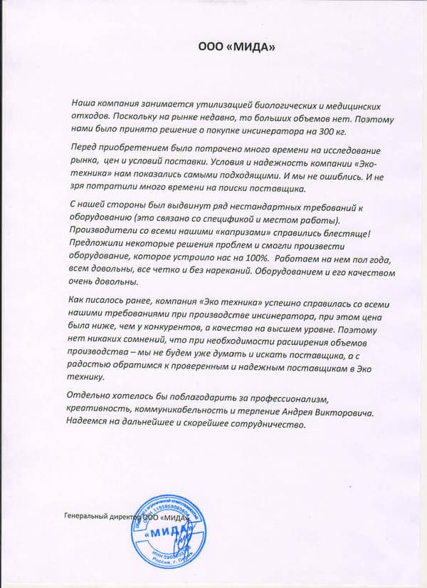 Перед приобретением инсинератора сотрудниками компании было потрачено много времени на исследования рынка, цен и условий поставки. По итогам была выбрана компания ООО «ПМК-Прогресс».